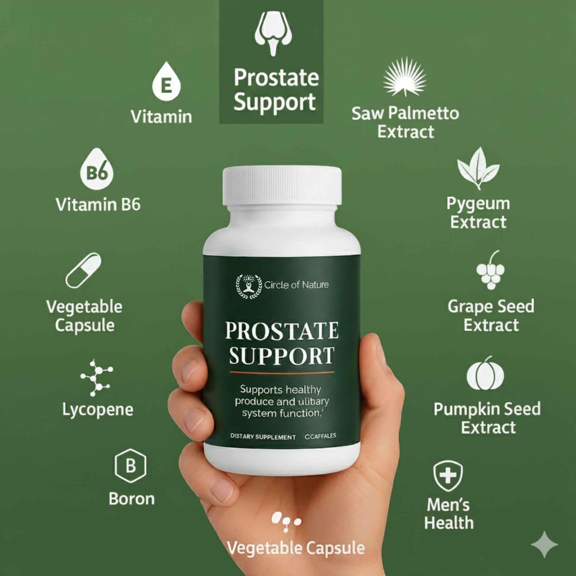 Vitamin E, Vitamin B6, Saw Palmetto Extract, Pygeum Extract, Grape Seed Extract, Pumpkin Seed Extract, Nettle Extract, Boron, Lycopene, Vegetable Capsule.