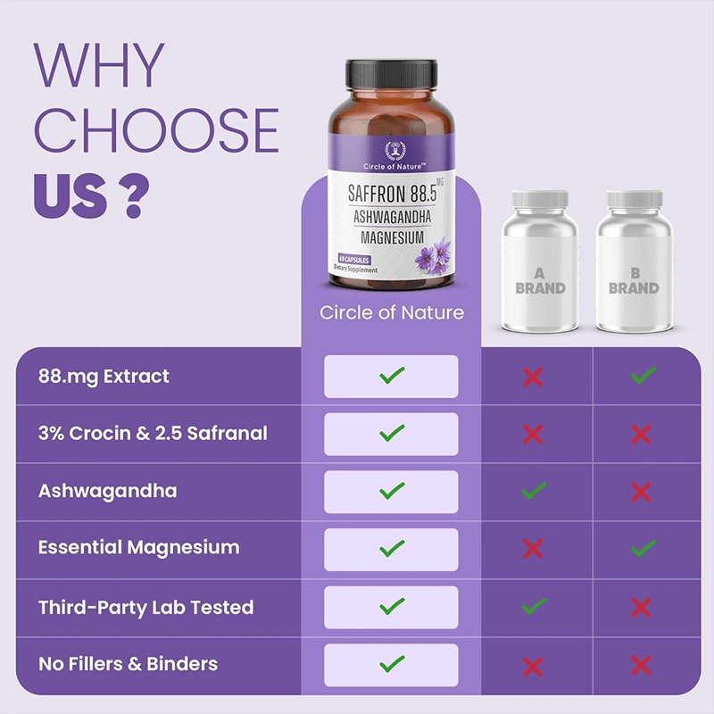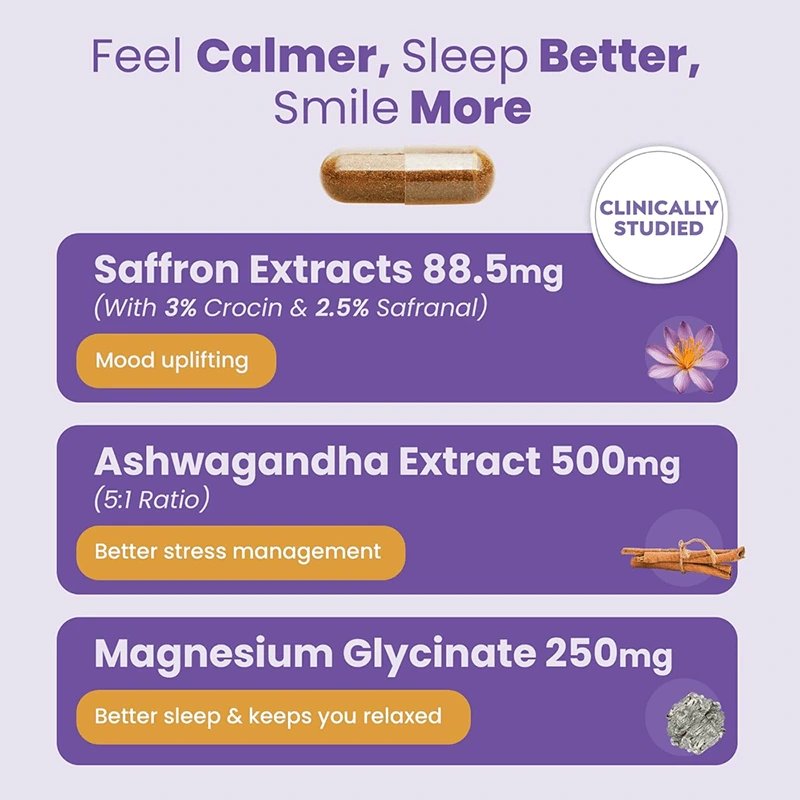 Saffron (88.5 mg) supports positive mood & emotional balance, while Ashwagandha and Magnesium promote calmness & stress relief.