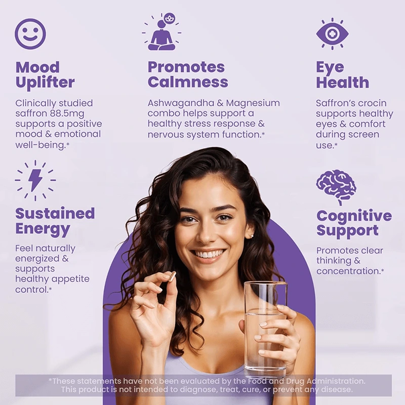 Mood & Emotional Balance Support: Standardized Saffron Extract (88.5 mg) helps support emotional wellness and positive mood.