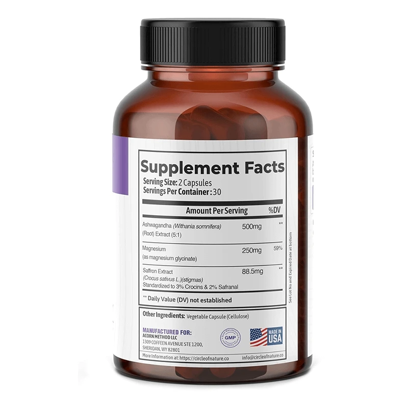 Saffron Extract (standardized to 3% Crocin & 2.5% Safranal), Ashwagandha Extract, Magnesium Glycinate, Vegetarian Capsule.